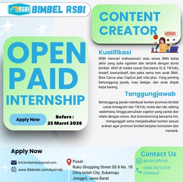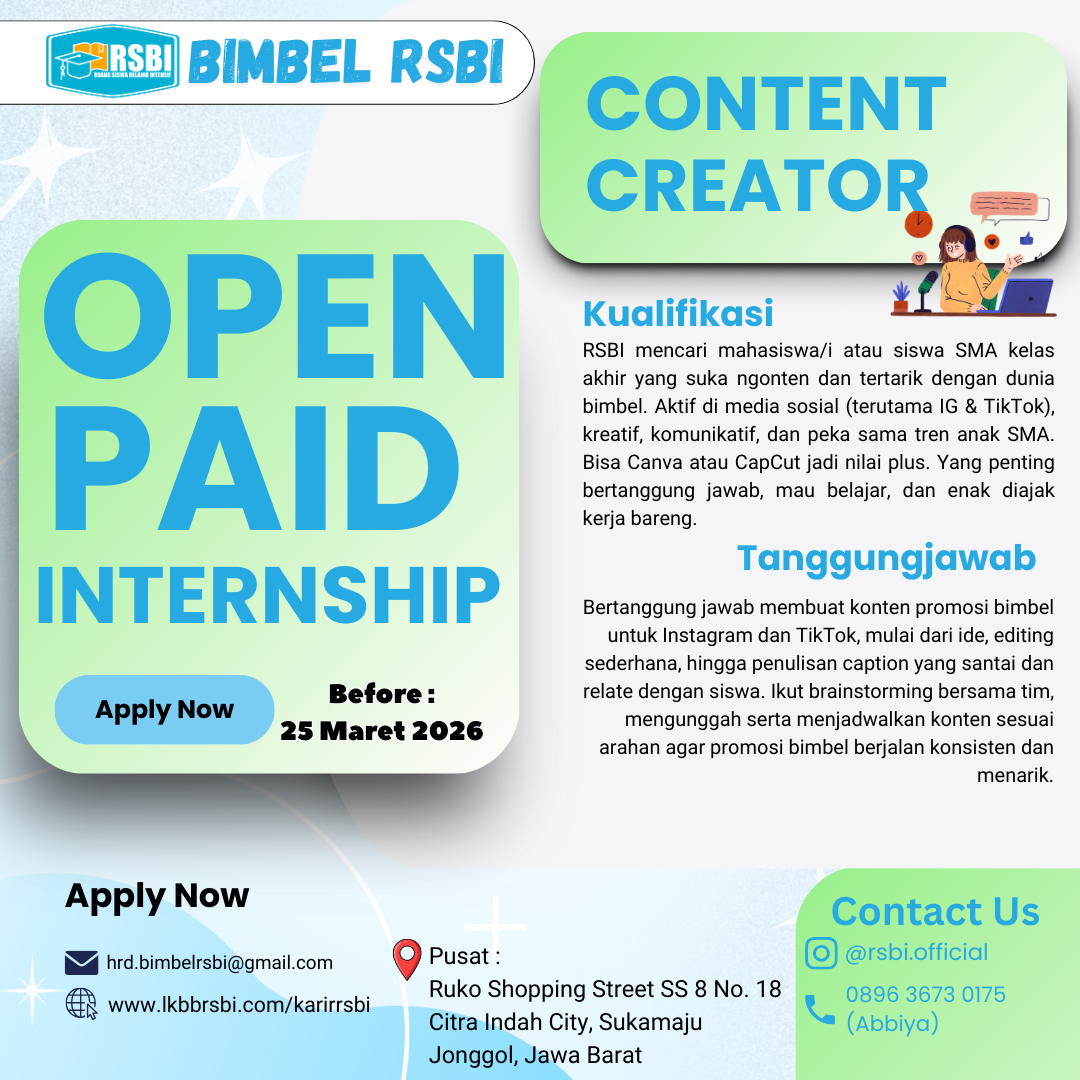 Suka bikin konten yang FYP? Punya ide-ide segar buat dunia pendidikan? Yuk, gabung sebagai Content Creator Intern! Di sini, kamu nggak cuma magang, tapi bakal jadi kreator di balik konten-konten edukatif yang asik dan kekinian.