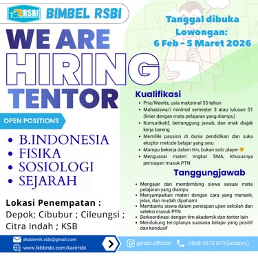 Layanan Konsultasi dan Bimbingan Belajar Ruang Siswa Belajar Intensif (LKBB RSBI) merupakan salah satu lembaga bimbingan terkemuka di wilayah Bogor Timur yang menerapkan sistem pembelajaran komprehensif (berupa pelaksanaan KBM reguler dan intensif, layanan konsultasi 1×24 jam, bimbingan motivasi serta konsultasi minat dan bakat, penyediaan bahan ajar berkualitas dengan sistem assesment online, serta menjalin relasi dengan orang tua terkait perkembangan peserta didik) yang tentunya sinergi dengan kurikulum nasional yang diterapkan di sekolah.